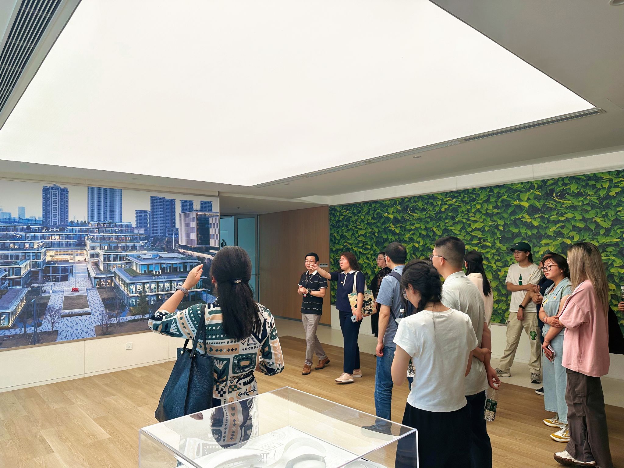 随后,企业专家带领同学们深入探访这座科技与生态交融的示范建筑。8000平方米的屋顶花园覆盖着高效的太阳能光伏板与生机勃勃的本土植物,形成强大的生态屋顶系统;三银双中空Low-E玻璃、气象跟踪自控天窗等技术的应用,使87%的功能房间达到自然采光标准,显著降低能耗。该建筑集成40余项前沿低碳技术,荣获中国绿色建筑三星最高认证及LEED金奖,其能耗仅为常规建筑的三分之一,年减碳量高达1027吨,正朝着“零废水、零能耗、零废弃物”的可持续目标坚定迈进。专家结合建筑实景,生动阐释了各项技术的节能原理与协同效应,使课本知识跃然眼前。
