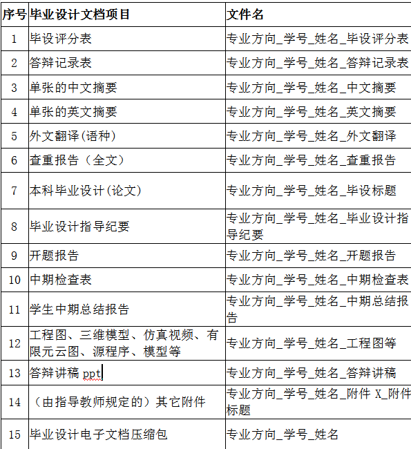 (2)学生需提交15份数字化资料(其中毕业设计论文需含word和pdf两个版本),所有电子资料放一个文件夹内,文件夹以“专业方向_学号_姓名”命名,压缩后提交指导教师。