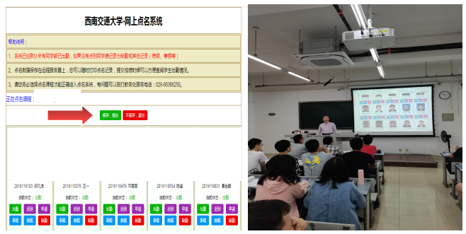 (2)教务网考勤为登录教务系统,选择“出勤考核—课堂考勤—签到”,进入西南交通大学网上点名系统,默认为出勤,如有特殊情况可进行选择,点名结束后保存提交即可。