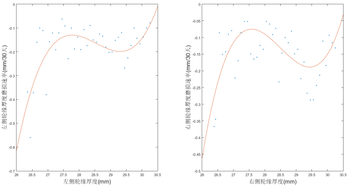 基于已有的上海地铁1号线01A06型车一年半的轮廓特征数据,经过数据预处理,平均值算法等步骤,得到了轮缘磨耗速率关于轮缘厚度的拟合曲线。踏面磨耗与踏面磨耗速率的相关性不强,对其建立了踏面磨损速率的概率数据库。