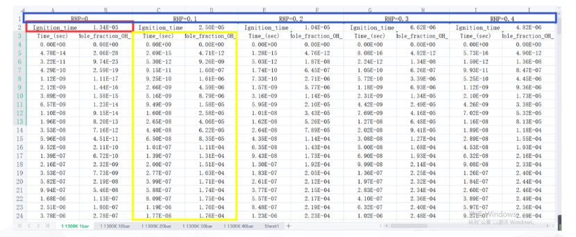通过利用Chemkin19.0零维均质模型,模拟仿真出了在不同初始条件下、不同H2O2添加比例下的点火延迟时间,在后处理中将OH自由基的摩尔分数随时间的变化导出到表格中,同时记录其点火延迟时间,最后整合不同反应条件的数据,对比分析。